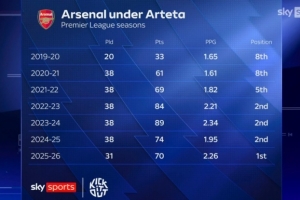 体育资讯3月17日讯 天空体育统计了阿尔特塔执教阿森纳以来每个赛季的英超场均积分,23-24赛季2.34分最高,本赛季2.26分次席。