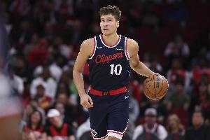 上半场比赛,快船全队外线投射手感不在状态,谁投谁铁,共计12中1,博格丹半场结束前命中首记三分。