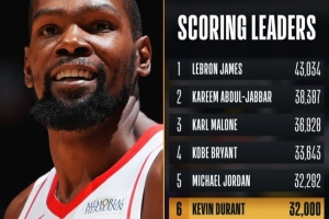 体育资讯2月28日讯 昨日,杜兰特在战胜魔术的比赛中拿到生涯第32000分,目前排名历史得分榜第六。