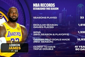 老詹本季所创纪录:23赛季/常规赛出战场次和命中数/生涯赢球次数